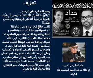 تلقينا ببالغ الحزن والأسى، نبأ وفاة المشمولة برحمة الله، صاحبة السمو الملكي الأميرة للا لطيفة، حرم المغفور له جلالة الملك الحسن الثاني، طيب الله مثواه، ووالدة صاحب الجلالة الملك محمد السادس، نصره الله وأيده وأطال عمره، وأصحاب السمو الملكي الأمراء والأميرات.