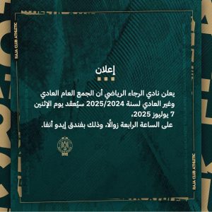 يقف نادي الرجاء الرياضي البيضاوي على أعتاب لحظة فارقة في تاريخه، حيث يعقد جمعاً عاماً عادياً وغير عادي يوم الاثنين 7 يوليو 2025، في ظل صراع ثلاثي محتدم على منصب الرئاسة، إلى جانب اتخاذ قرارات استراتيجية جوهرية تشمل الموافقة على شراكة استثمارية كبرى قد تغير وجه النادي.
