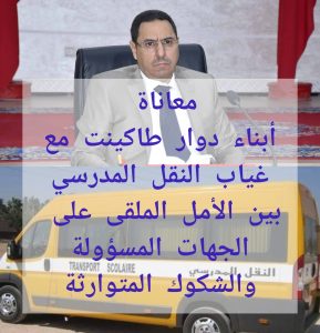 من هنا ندعو كافة المسؤولين إلى العمل الجماعي المتواصل لتوفير أسطول نقل مدرسي منظم، وآمن، وفعال، يضمن للأطفال والسكان كرامتهم وأمنهم، ويكفل لهم فرصة تعليمية عادلة تؤهلهم لمستقبل أفضل، حتى لا يتحول تعليم أبنائنا في دوار طاكينت إلى معاناة أخرى تضاف إلى معاناتهم السابقة.