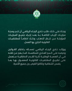 ويضع هذا الموقف “الأخضر” العصبة الوطنية لكرة القدم الاحترافية أمام تحدٍ تنظيمي وقانوني معقد، حيث يهدف النادي من خلال هذا القرار إلى ضمان مبدأ تكافؤ الفرص بين جميع الأندية المتنافسة، وتفادي أي ارتباك قد يطرأ على عدالة المنافسة في النصف الثاني من الموسم.